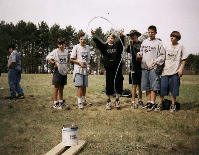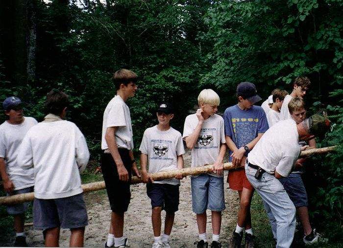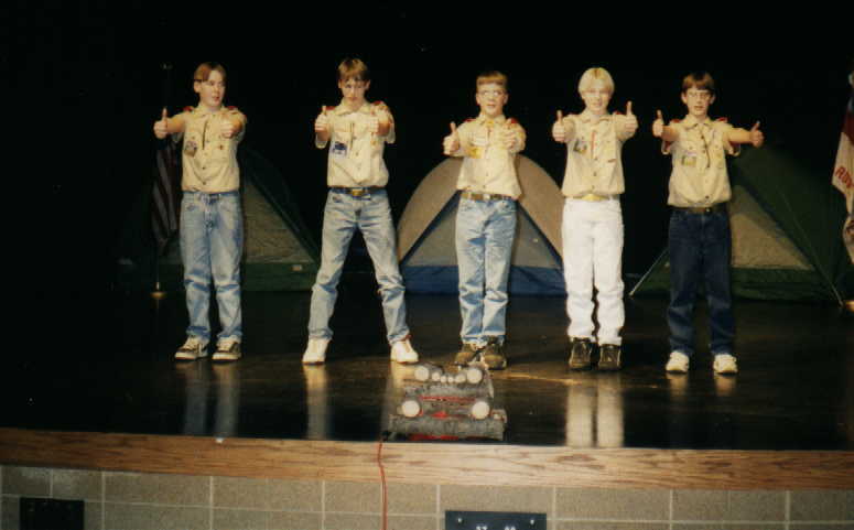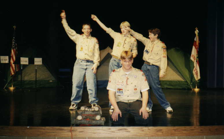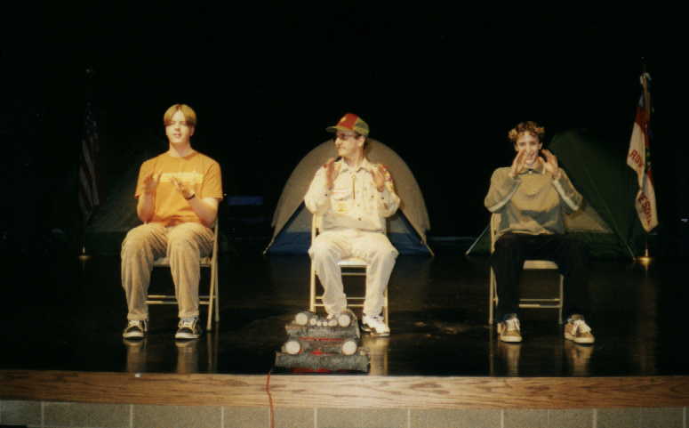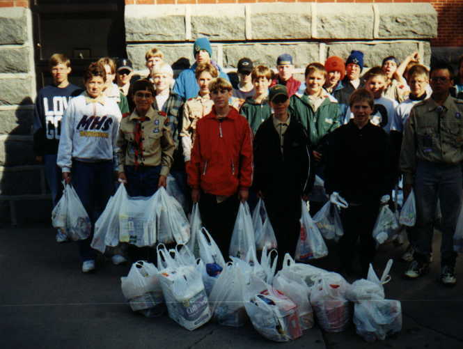 On January 24, 1998, Troop 68 held its third "Laughs For Lunch" program. This program was a campfire program performed at the high school auditorium, complete with songs and skits. It was open to the public. The troop also used the program as a service project by asking people who attended the show to bring a nonperishable food item. Thus we provided the laughs while the audience provided the lunch for the needy.